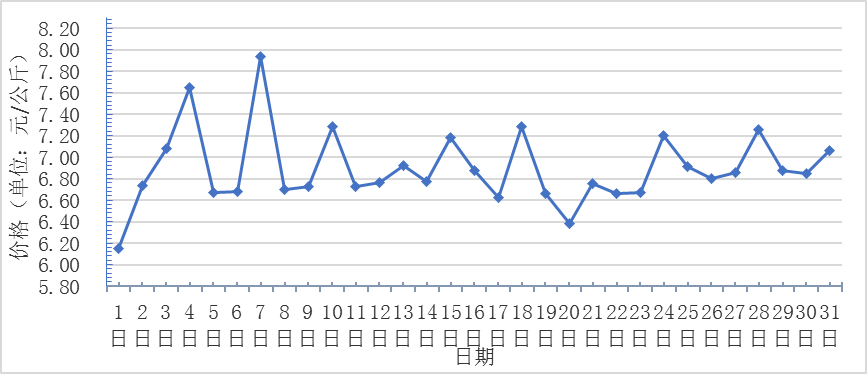 10月,全國(guó)重點(diǎn)監(jiān)測(cè)農(nóng)產(chǎn)品批發(fā)市場(chǎng)香蕉總交易量達(dá)2.3萬(wàn)噸,同比上漲9.5%,環(huán)比下降11.5%;總交易價(jià)值15349.4萬(wàn)元,同比上漲11.9%,環(huán)比下降4.9%。日平均價(jià)格最高為8.0元/千克,最低為6.2元/千克,全月平均價(jià)格為 6.9元/千克,同比上漲3.0%,環(huán)比上漲13.1%(每日價(jià)格變化如圖)。