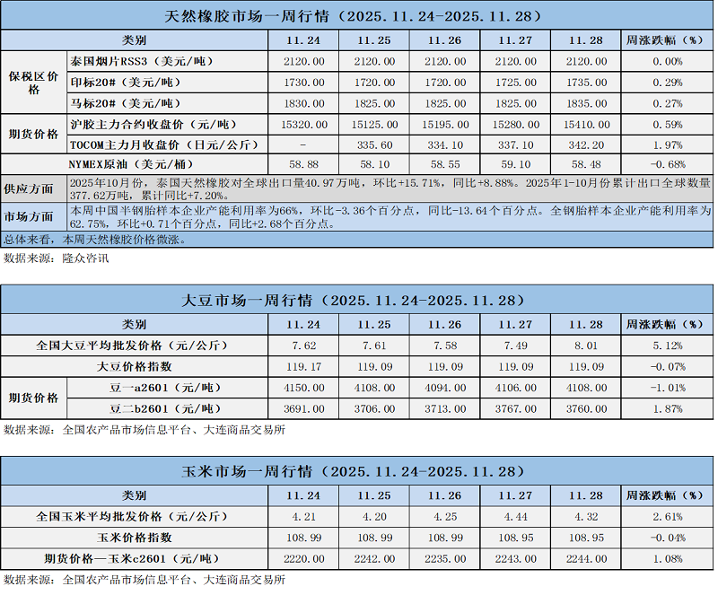 天然橡膠、大豆、玉米市場一周行情(2025.11.24-11.28)