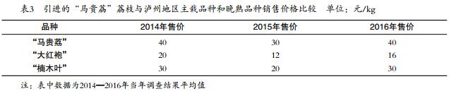 2014—2016年,引進(jìn)的“馬貴荔”荔枝平均銷售價(jià)格分別為40元/kg、30元/kg和40元/kg。與瀘州地區(qū)主栽品種和晚熟品種相比,2014年引進(jìn)的“馬貴荔”荔枝平均銷售價(jià)格為“大紅袍”荔枝的2.0倍、“楠木葉”荔枝的1.3倍;2015年引進(jìn)的“馬貴荔”荔枝平均銷售價(jià)格為“大紅袍”荔枝的2.5倍、“楠木葉”荔枝的1.5倍;2016年引進(jìn)的“馬貴荔”荔枝平均銷售價(jià)格為“大紅袍”荔枝的2.5倍、“楠木葉”荔枝的1.3倍??梢?jiàn)“馬貴荔”荔枝引進(jìn)瀘州后,連續(xù)3年銷售價(jià)格高于當(dāng)?shù)刂髟缘摹按蠹t袍”荔枝和當(dāng)?shù)赝硎斓摹伴救~”荔枝。